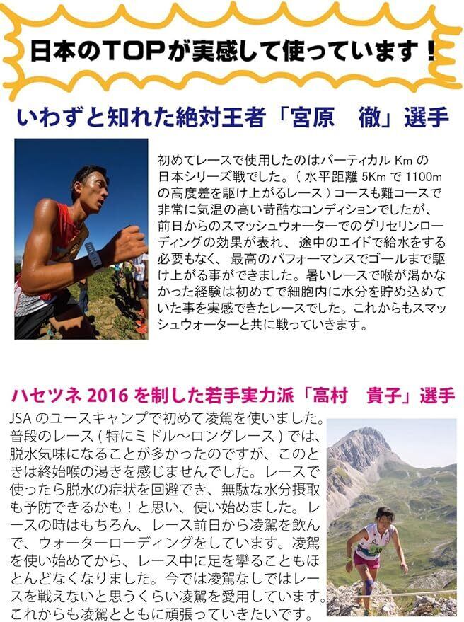 熱中症、脱水、足のつり、スポーツ時の水分補給、マラソン、トレラン、トライアスロン、テニス、サッカー関節痛(膝、肘、腰、肩、足首など)、筋肉痛、お肌の乾燥、あかぎれなど気になる方。潤滑成分と水分をしっかり補給します。凌駕の特徴でもあるグリセリンローディングが最大の特徴で、水分を保ちやすくなります。